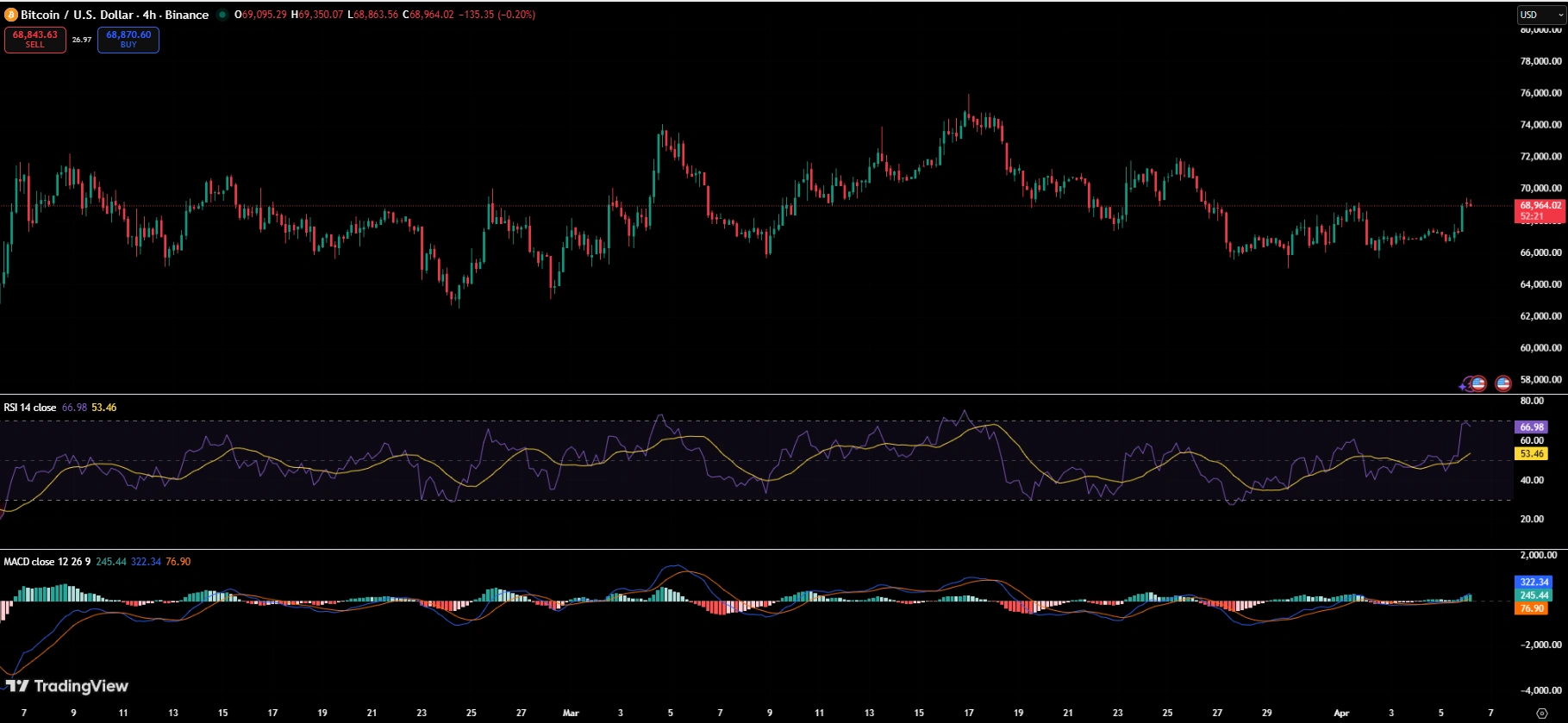 نمودار ۴ ساعته در صرافی بایننس نشان میدهد که بیتکوین پس از حرکت از کفهای نزدیک به ۶۵,۰۰۰ دلار در اواخر مارس، در حال تثبیت است. شاخص RSI در خط سریع روی ۶۶.۹۸ و در خط سیگنال روی ۵۳.۴۶ قرار دارد که نشاندهنده مومنتوم (قدرت حرکت) است بدون اینکه از نظر فنی وارد محدوده «اشباع خرید» شده باشد. شاخص MACD یک تقاطع مثبت را همراه با مقداری گسترش در هیستوگرام نشان میدهد، اما هیچیک از این خوانشها آنقدر تهاجمی نیستند که نشاندهنده یک شکست قیمتی (Breakout) قریبالوقوع باشند.