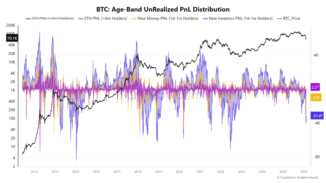 به طور متوسط، در چرخههای گذشته، بازار پس از تجربه ضرر ۶۸ درصدی به کف خود میرسید. اما در اصلاح فعلی، اوج ضرر دارندگان کوتاهمدت تنها ۴۰٪ بوده است؛ یعنی حدود ۳۰ درصد کمتر از میانگین تاریخی. با بازگشت قیمت از محدوده ۶۶,۹۲۸ دلار به بالای ۷۰,۰۰۰ دلار، این میزان ضرر اکنون به ۳۱٪ کاهش یافته است.