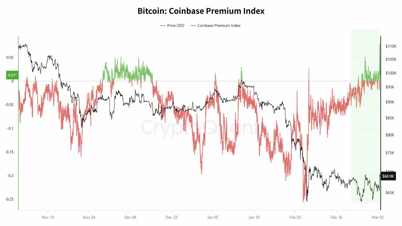 شاخص پرمیوم کوینبیس در وبسایت کریپتوکوانت (CryptoQuant) از اوایل مارس ۲۰۲۶ وارد محدوده مثبت شده است؛ این اتفاق نشاندهنده آن است که خریداران مستقر در ایالات متحده برای اولین بار از اواسط ژانویه، در حال پرداخت مبلغی بیشتر (پرمیوم) برای خرید بیتکوین در صرافی کوینبیس نسبت به سایر صرافیها هستند.