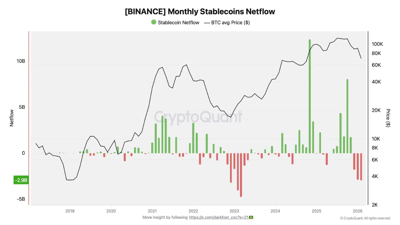 دادههای جدید پلتفرم تحلیلی CryptoQuant نشان میدهد که صرافی بایننس برای سومین ماه متوالی با جریان خالص منفی استیبلکوینها روبروست. این روند که یادآور دوران بازار خرسی سال ۲۰۲۳ است، از یک انقباض جدی در نقدینگی کل بازار کریپتو حکایت دارد.