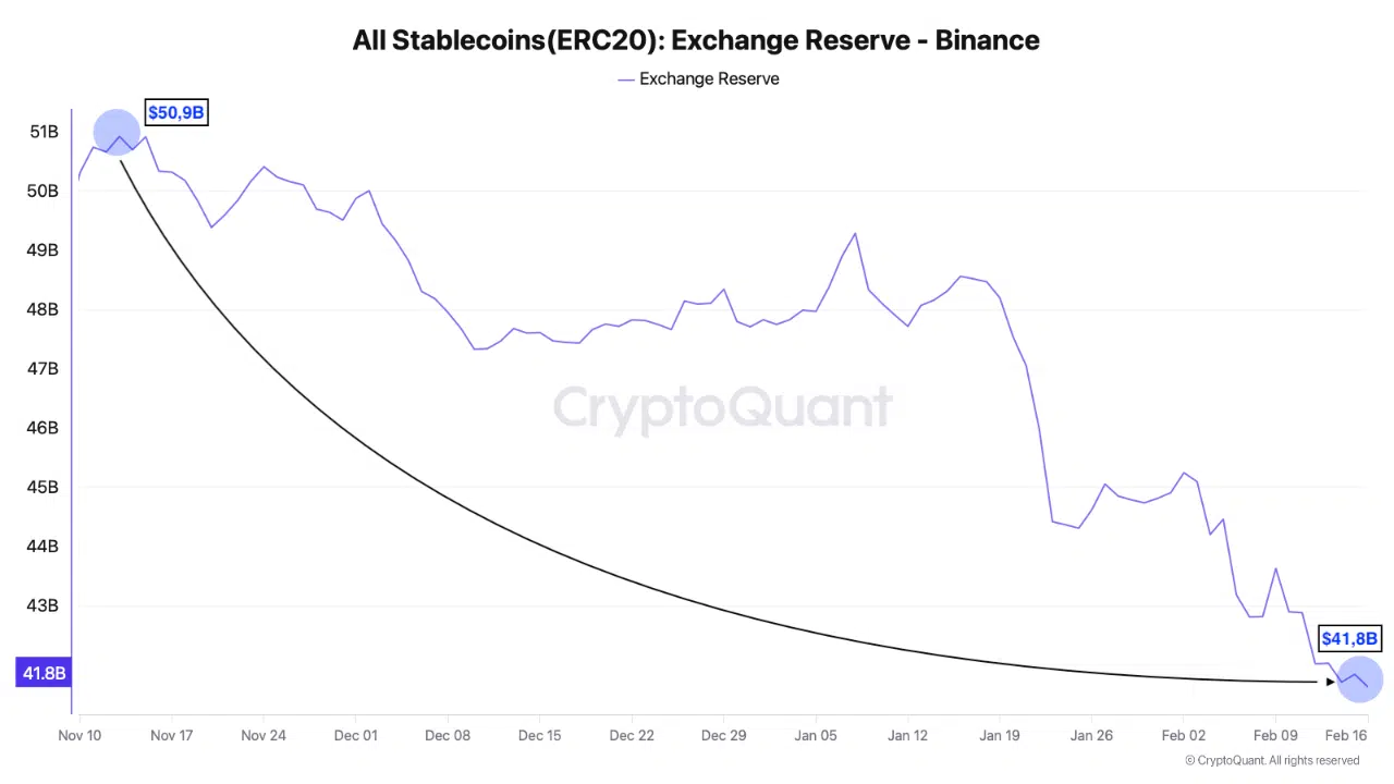 این تخلیه نقدینگی مستقیماً در ذخایر بایننس مشهود است. از ماه نوامبر تاکنون، ذخایر استیبلکوین این صرافی از ۵۰.۹ میلیارد دلار به ۴۱.۸ میلیارد دلار کاهش یافته است؛ یعنی کاهشی معادل ۹ میلیارد دلار در کمتر از ۹۰ روز.