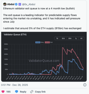 انتظار میرود اگر روند فعلی حفظ شود، صف خروج ولیدیتورها تا ۳ ژانویه (۱۴ دی ماه) به صفر برسد. رسیدن این صف به عدد صفر به معنای حذف یکی از اصلیترین منابع فشار فروش در سال ۲۰۲۵ خواهد بود.