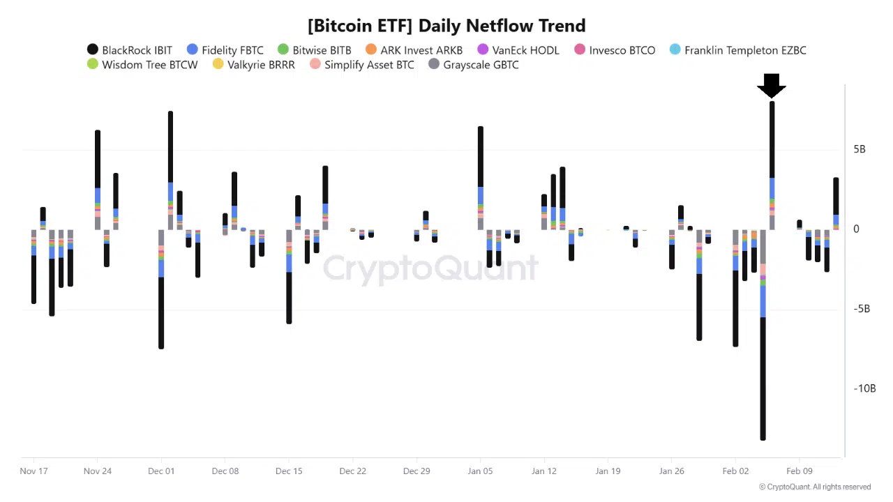 در تاریخ ۶ فوریه، جریان ورودی به ETFها مثبت شد که نشاندهنده تقاضای مجدد نهادهای مالی است. صندوق IBIT شرکت بلکراک (BlackRock) با جذب بیش از ۴.۸ میلیارد دلار سرمایه خالص، پیشتاز این حرکت بود. صندوق FBTC فیدلیتی نیز با حدود ۱.۳۱ میلیارد دلار ورودی مثبت در رتبه بعدی قرار گرفت.