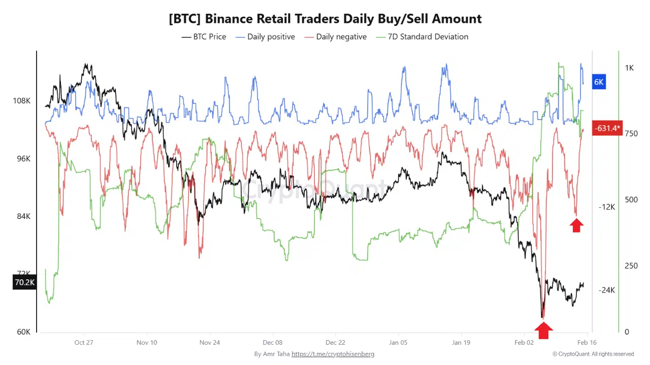 دادههای مربوط به شاخص خرید و فروش روزانه معاملهگران خرد در بایننس، نشاندهنده دو موج بزرگ فروش توسط دارندگان کوتاهمدت در ماه فوریه است: