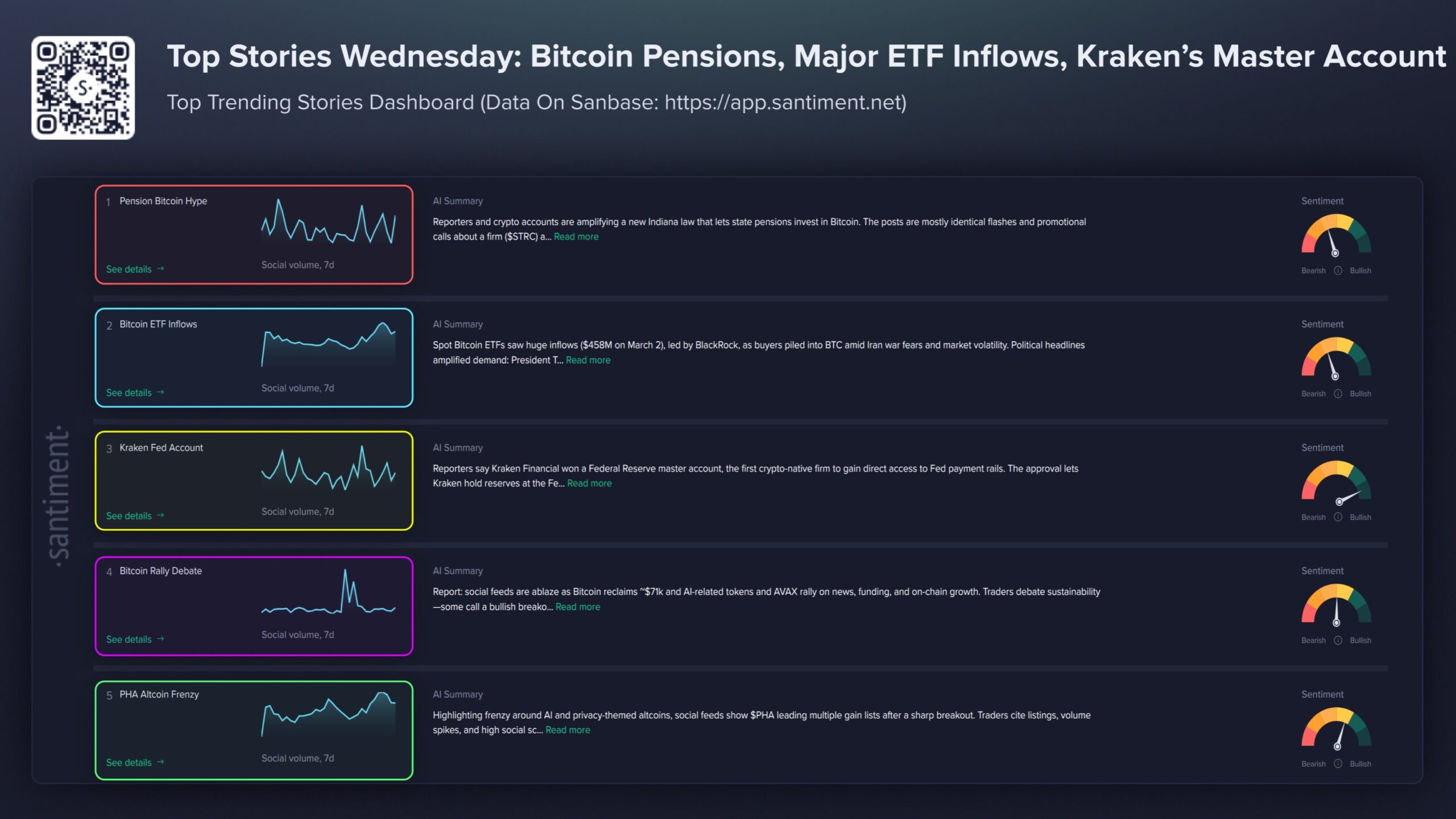 هیچ شرکت بومی کریپتویی قبلاً چنین چیزی نداشته است. اثر عملی این است که کراکن اکنون میتواند با سطحی از زیرساخت تسویه دلاری فعالیت کند که پیش از این در هر مرحله مستلزم یک بانک سنتی واسطه بود. این امر ریسک طرف مقابل را کاهش میدهد، هزینههای تسویه را پایین میآورد و از همه مهمتر، سیگنال میدهد که فدرال رزرو مایل است این دسترسی را به یک صرافی کریپتو اعطا کند. این یک تصمیم سیاستی با پیامدهایی فراتر از شخص کراکن است. جالب اینجاست که شاخص احساسات (Sentiment Gauge) درباره این خبر در داشبورد سنتیمنت به طور قابل توجهی خرسیتر از سایر موضوعات ترند شده است. این ممکن است منعکسکننده تردید درباره پیامدها، نگرانی از زیادهروی مقرراتی، یا صرفاً جدید بودن داستان باشد که هنوز بازار به اجماع نظری درباره آن نرسیده است.