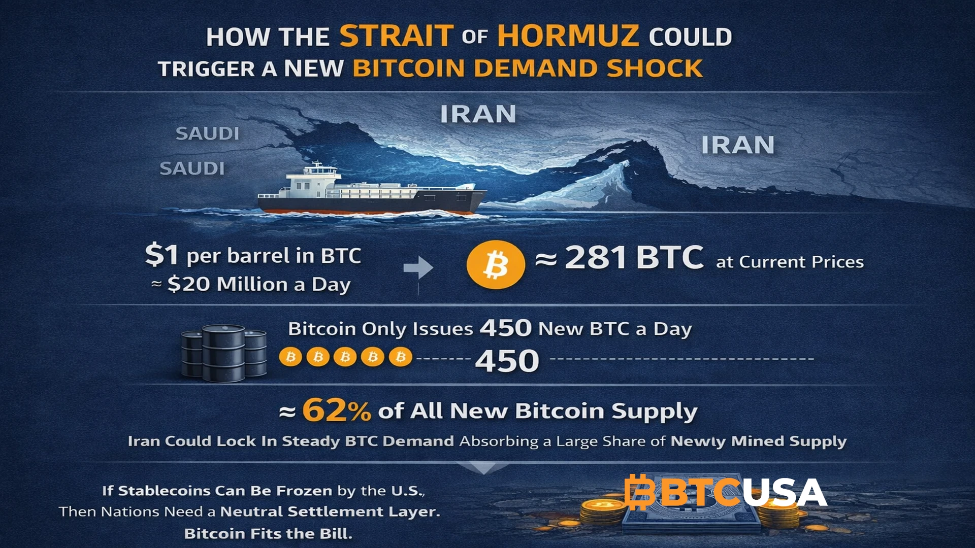 عوارض ۱ دلاری به ازای هر بشکه، به معنای جریان روزانه تقریباً ۲۰ میلیون دلار است. با قیمتهای فعلی، این رقم معادل حدود ۲۸۱ بیتکوین در روز است؛ رقمی که تقریباً ۶۲ درصد از کل بیتکوینهای تازهاستخراجشدهای را که وارد چرخه میشوند، نشان میدهد.